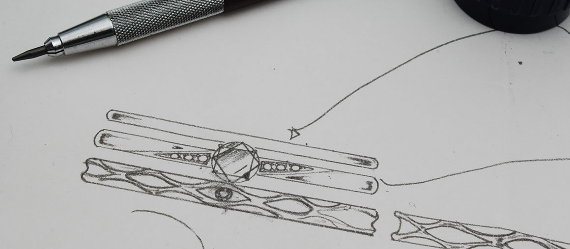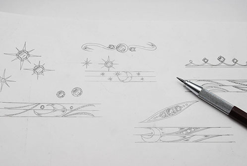 ご希望や指輪のイメージをお伺いします。お話の中からデザインが生まれますので色々なご希望をお聞かせください。ご希望を元にデザイン画とお見積りをご用意します。デザイン画はご納得いただけるまで、何枚でもお描きします。